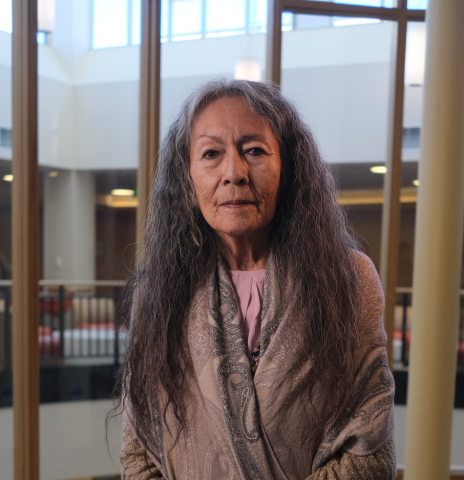 Portrait of Christina with long hair wearing a gray shawl in a well lit room