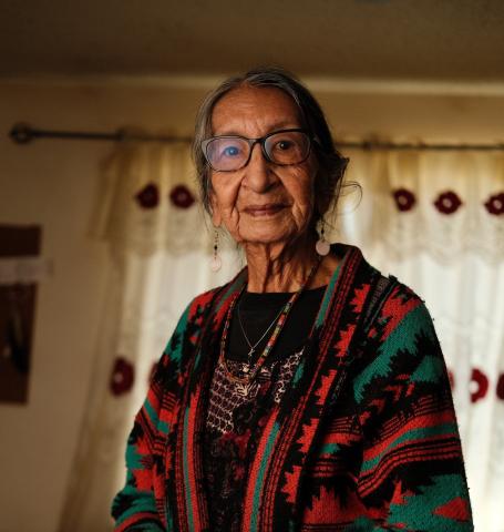 Portrait of Delphine Bad Wound wearing a shawl in a living room