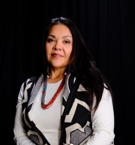 Portrait of Elaine (Juanita) Castillo wearing a black and white shirt with beaded necklace against a black background